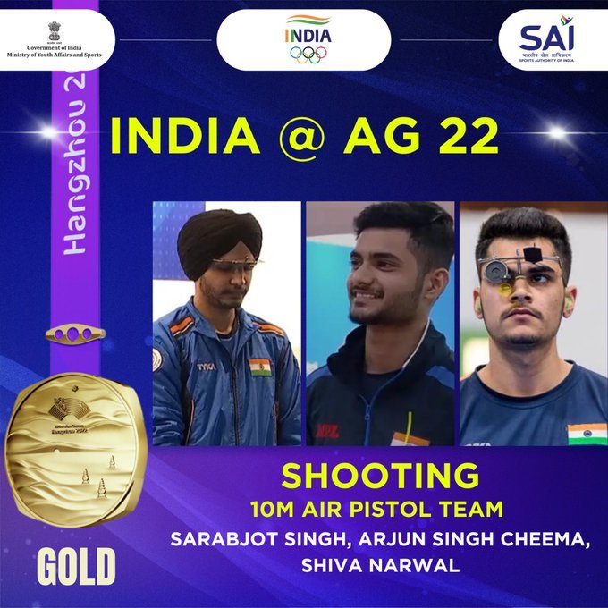 Sarabjot Singh, Arjun Singh Cheema and Shiva Narwal finished with a combined score of 1734, with a whopping 50 hits in the inner 10 circle, to win gold ahead of China (1733-62x) and Vietnam (1730-59x).