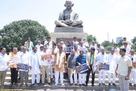 The Leader of the Opposition in the Legislative Assembly, R. Ashoka, staged the protest before the Mahatma Gandhi statue on the premises of the Vidhana Soudha.