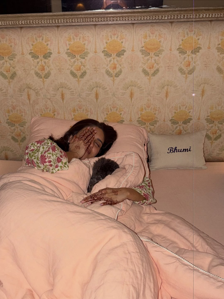 In the first picture from the post, Bhumi is seen cuddling with one of her four-legged friends in bed. Another video from the album had her pet sleeping comfortably in her lap.
