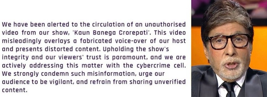 “We have been alerted to the circulation of an unauthorised video from our show, ‘Kaun Banega Crorepati’. This video misleadingly overlays a fabricated voice-over of our host and presents distorted content,” the Sony TV said in a statement.