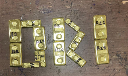 During the search, officers discovered seven one-kilogram foreign-marked gold bars and one cut piece of a foreign-marked gold bar hidden in waist bags, concealed underneath the clothing of two of the passengers.