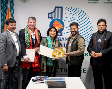 The delegation, including Minister Ponguleti Srinivasa Reddy, detailed Hyderabad’s leading capabilities in aerospace, defence, bio-design, software, and pharma. Adding that the current focus of the government is promotion of electric vehicles and transition to renewable energy, they also explained about the various skilling initiatives being taken up through the newly launched Advanced Technology Centres, the Young India Skills University and the Young India Sports University.