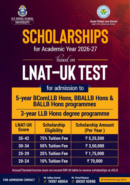For the 5-year integrated law programs, the admissions cut-off is 20 out of 42 in the LNAT-UK. Applicants who have scored below 20 out of 42 in the LNAT-UK are eligible for a limited retest opportunity, applicable only for admission to JGLS for the Academic Year 2026–27.