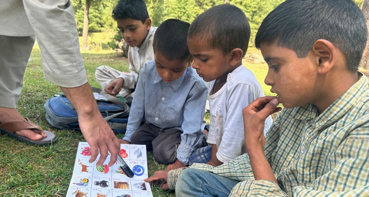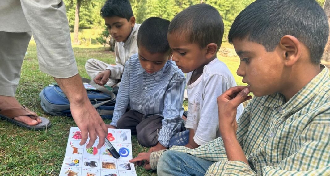 There is a white board that Bilal Ahmad Kumar (27), the teacher, uses to introduce his students to their subjects of study, besides picture books from which children read. Sitting on the grass patch, children learn Mathematics, English, Science, Kashmiri and much more.
