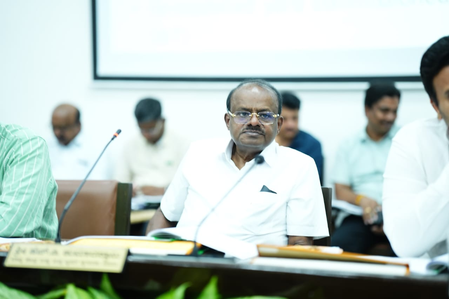 During his visit, Union Minister Kumaraswamy chaired the Mysuru District Development and Monitoring Committee (DISHA) meeting at the Zilla Panchayat office.