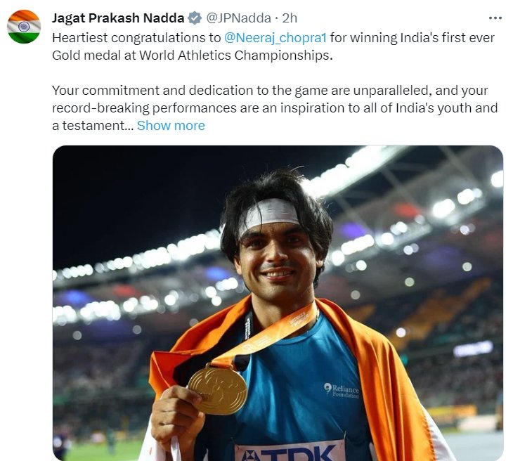 “Heartiest congratulations to Neeraj Chopra for winning India’s first ever Gold medal at World Athletics Championships,” Nadda wrote on X (formerly twitter).