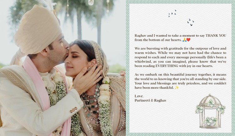 Taking to X (formerly Twitter), she posted a picture which said: “Raghav and I just wanted to take a moment to say THANK YOU from the bottom of our hearts. We are bursting with the outpour of love and warm wishes. While we may not have had a chance to respond to each message personally (life’s been a whirlwind as you can imagine), please know that we’ve been reading EVERYTHING with joy in our hearts.”