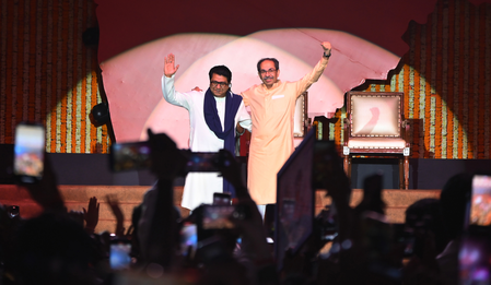 Mumbai, July 5 (IANS) After 20 years, estranged brothers Uddhav and Raj Thackeray reunited on the politically sensitive issue of Marathi pride, language, Marathi Manoos and united Maharashtra with a call to continue unity in future too. They also dropped hints that their handshake was not restricted to oppose imposition of Hindi along with Marathi and English from grade one but also to together contest the ensuing BrihanMumbai Municipal Corporation to keep the BJP-led MahaYuti at bay.